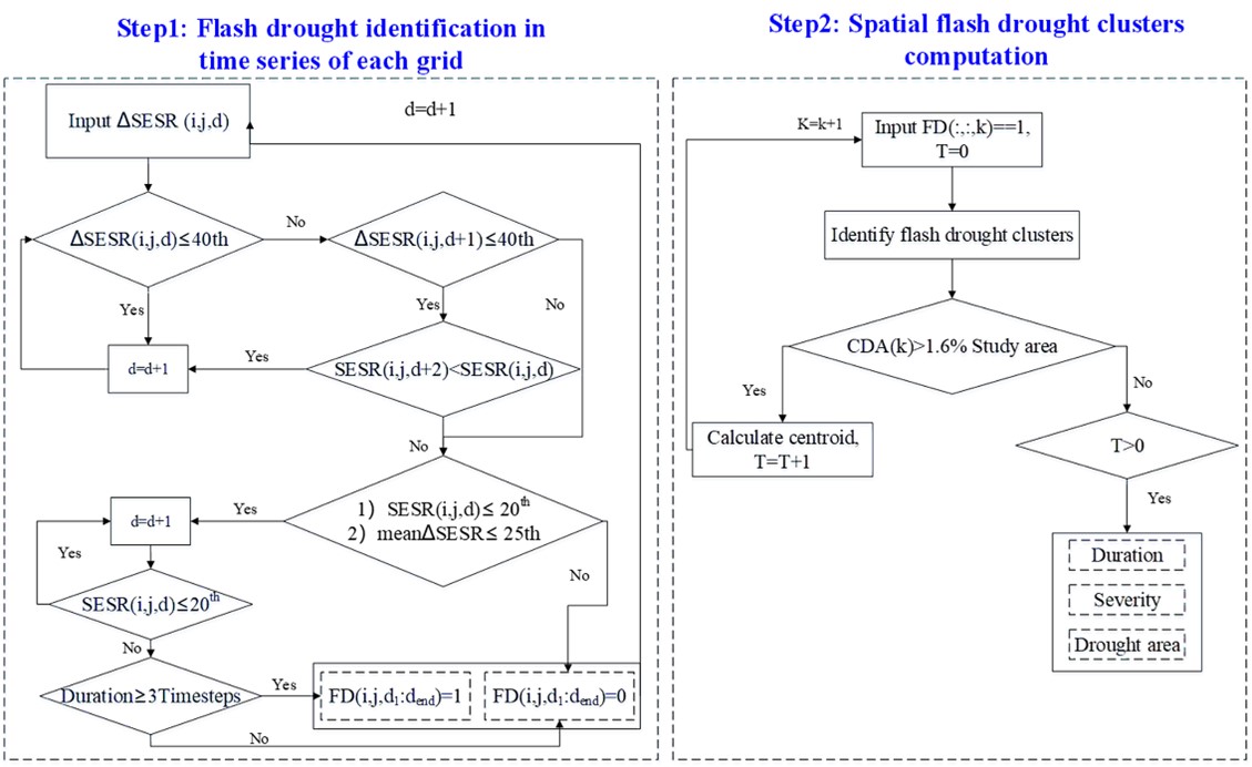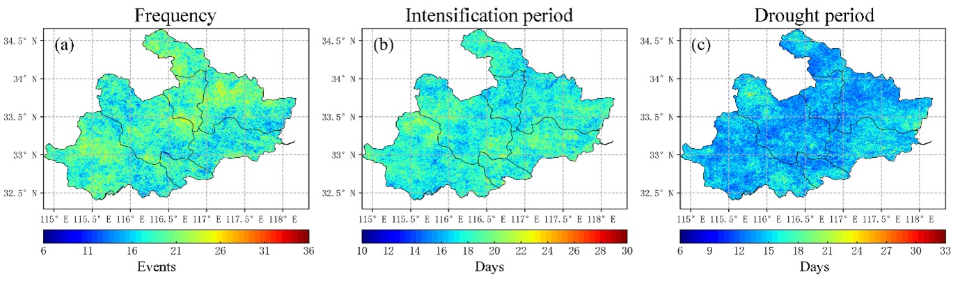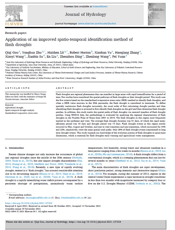 20世纪70年代以来,气候变化不仅导致全球和区域干旱频率呈增加趋势,干旱特征也发生了显著变化。近年来,一种被称为“骤旱”的新型干旱,因其发展迅速且具有的较大的社会经济影响而引起了广泛关注。骤旱历时较短,通常仅有二十几天,其引起的土壤湿度的急剧降低会严重影响农作物的正常生长,这种突发性也使得区域灾害预警、防灾措施的有效实施更加困难。骤旱与传统干旱特性的显著差异也使得现有旱灾理论在骤旱的监测、预警及防治中效果并不理想。针对以往研究不足,2021年11月,我院教授朱永华和吕海深指导博士生苟琪琪在水文学知名期刊Journal of Hydrology上发表题为Application of an improved spatio-temporal identification method of flash droughts的论文。论文将骤旱研究的关注点从仅考虑干旱的迅速发展期扩展到同时考虑干旱的迅速发展期和之后的干旱持续期(如图1),进一步强调了骤和旱的两个特征。基于改进的骤旱识别准则,论文构建了一种同时识别骤旱时空分布的二维骤旱识别方法(如图2),并将其应用于位于中国湿润半湿润过渡区的淮北平原。研究结果表明:淮北平原的东北部和西部更易发生骤旱;该地区骤旱平均持续时间为31天,其中干旱迅速发展期平均为18天,干旱持续期平均为14天(如图3);该地区骤旱主要发生在5月、8月和10月,东西路径转移的事件占44%,仅26%的骤旱事件发展为季节性干旱事件。成果进一步完善了骤旱演变过程,并将我们对骤旱演变过程的了解拓宽到时空维度,对于骤旱预警和农业水资源管理至关重要。论文链接:Gou Q., Zhu Y., Lü H., Horton R., Yu X., Zhang H., Wang X., Su J., Liu E., Ding Z., Wang Z., Yuan F. (2021). Application of an improved spatio-temporal identification method of flash droughts. J HYDROL, 127224. doi: 10.1016/j.jhydrol.2021.127224. https://www.sciencedirect.com/science/article/pii/S0022169421012749