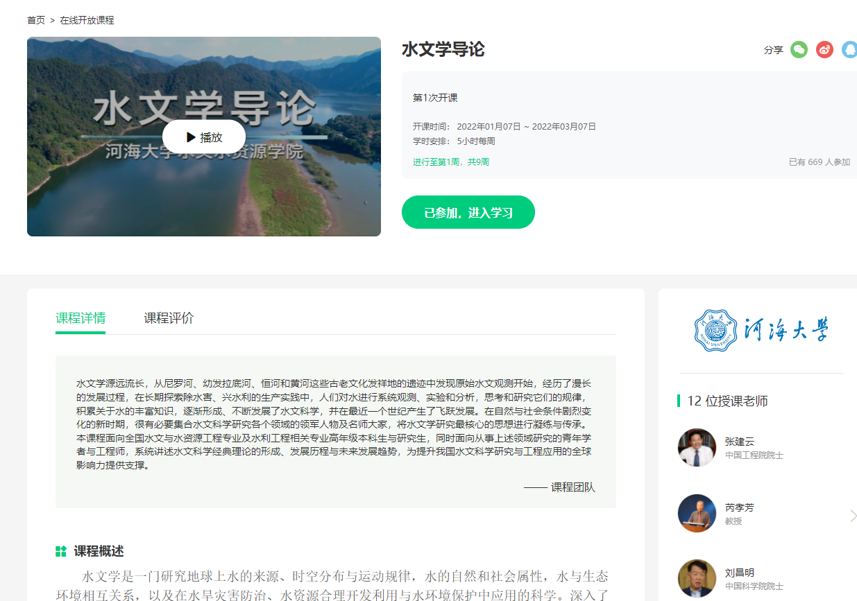 2022年1月7日,由河海大学水文水资源学院发起,中国工程院院士、英国皇家工程院外籍院士、长江保护与绿色发展研究院院长张建云教授担任课程负责人,云集张建云院士、芮孝芳教授、刘昌明院士、刘国纬教高、林学钰院士、束龙仓教授、王俊教高、包为民教授、陈元芳教授、王浩院士、丁永建研究员、夏军院士、丁一汇院士等全国水文水资源领域院士和名师,共同打造完成的全国首部《水文学导论》课程隆重上线“中国大学MOOC”网站(https://www.icourse163.org/course/HHU-1465909162?from=searchPage)。