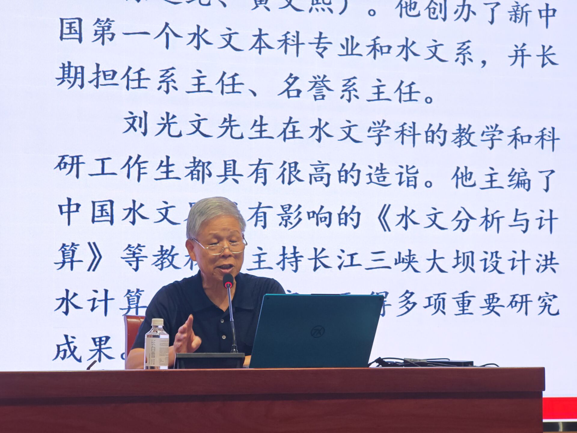 黄振平教授从“生平简介”、“高风亮节”、“铸就辉煌”、“精神永存”四个方面详细讲述了光文先生的感人事迹,弘扬了光文先生的高尚品德。黄教授强调,刘光文先生不仅在学术上取得了极高的成就,比如一手创办新中国第一个水文本科专业、水文系,主编了中国水文界最有影响的《水文分析与计算》、《英汉水文学词汇》、《应用数学》、《水文统计及近似计算》等著作、译著和教材。而且光文先生身上展现出的爱国、友善、正直、勤俭等高尚品德更是让人心生敬佩。哪怕是动荡年代,刘光文先生依然恪守学术信仰和道德底线,用言传身教影响他人,用实际行动诠释了责任与担当。