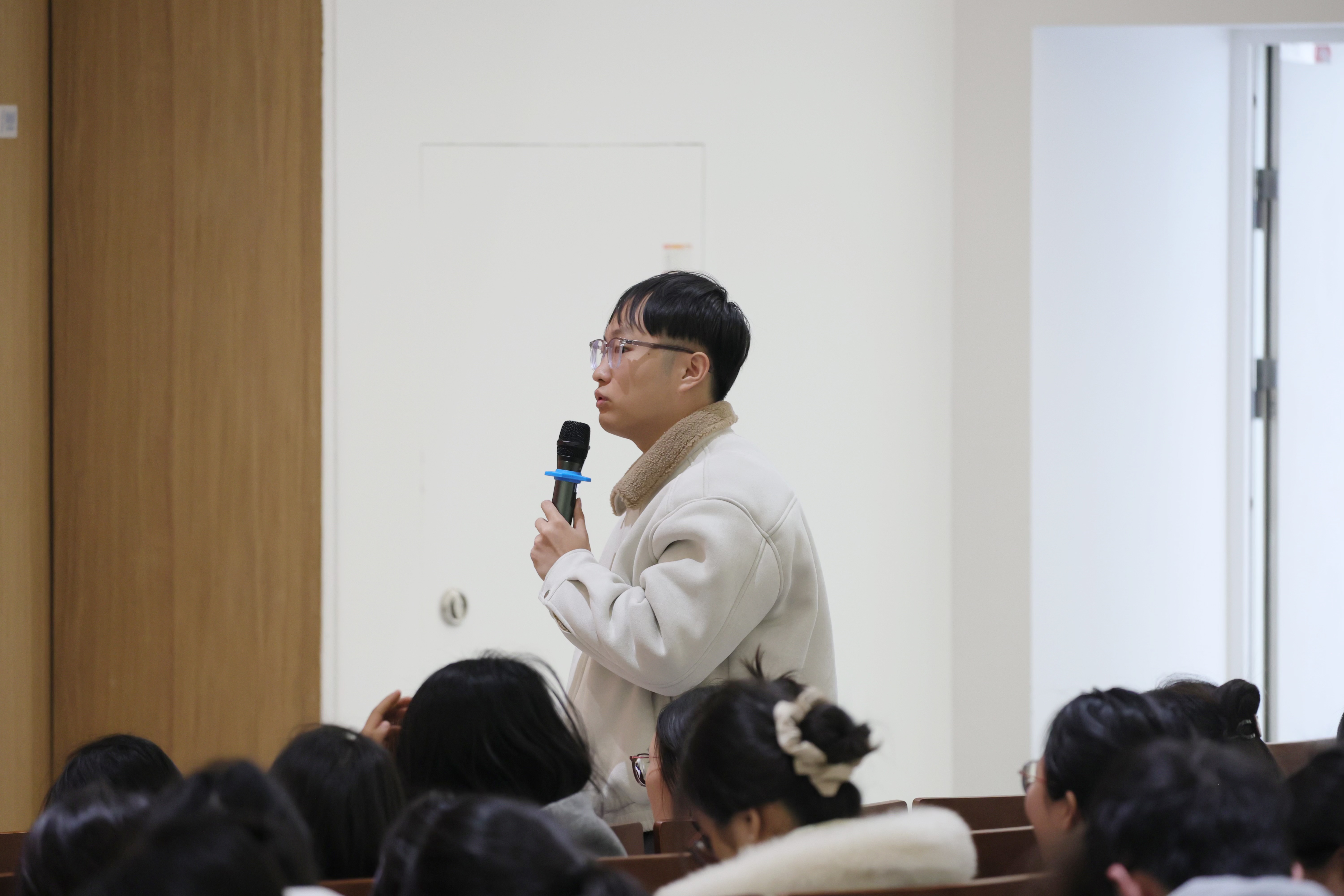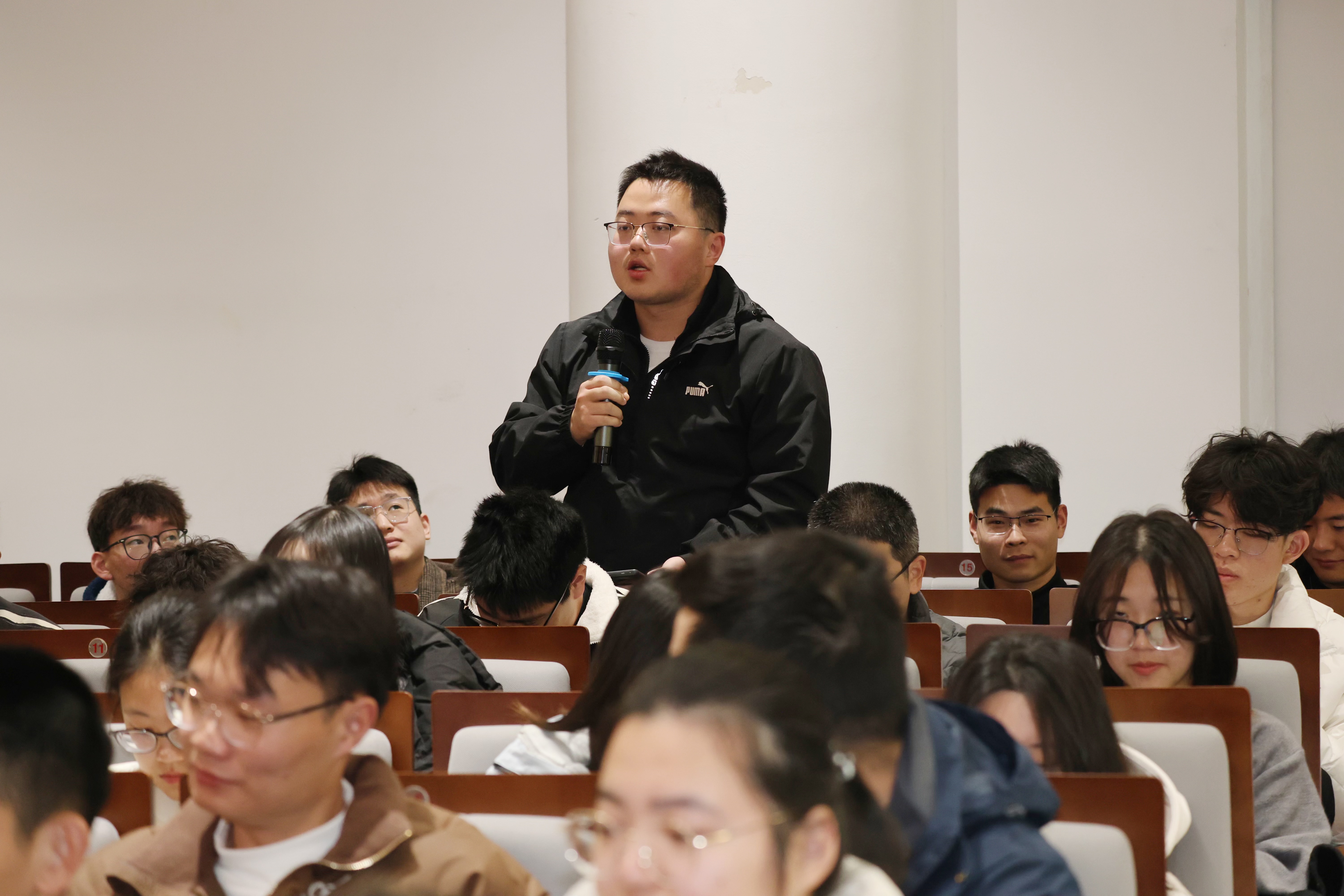 石朋书记针对研究生阶段的学习与规划,为同学们提出了宝贵建议:一是夯实专业基础,通过学习和积累扎实学术根基,实现突破提升;二是发掘、发挥个人特长,构建差异化优势,强化核心竞争力;三是注重实践锻炼,通过投身科研项目、实习实践等丰富实战经验,提升问题解决能力。江鹏老师结合自身的求学和就业经历分享了心得体会,鼓励同学们要秉持持之以恒的精神,勇于面对挑战,不断追求卓越。李源老师提醒同学们结合自身情况做好合理规划,并积极利用各类资源,提高认知与素养,为学术研究和职业发展奠定基础。吴南学姐分享了在瑞典隆德大学的留学经历,她建议同学们专注当下,学会舒缓焦虑情绪,乐观面对学习和生活中遇到的困难。
