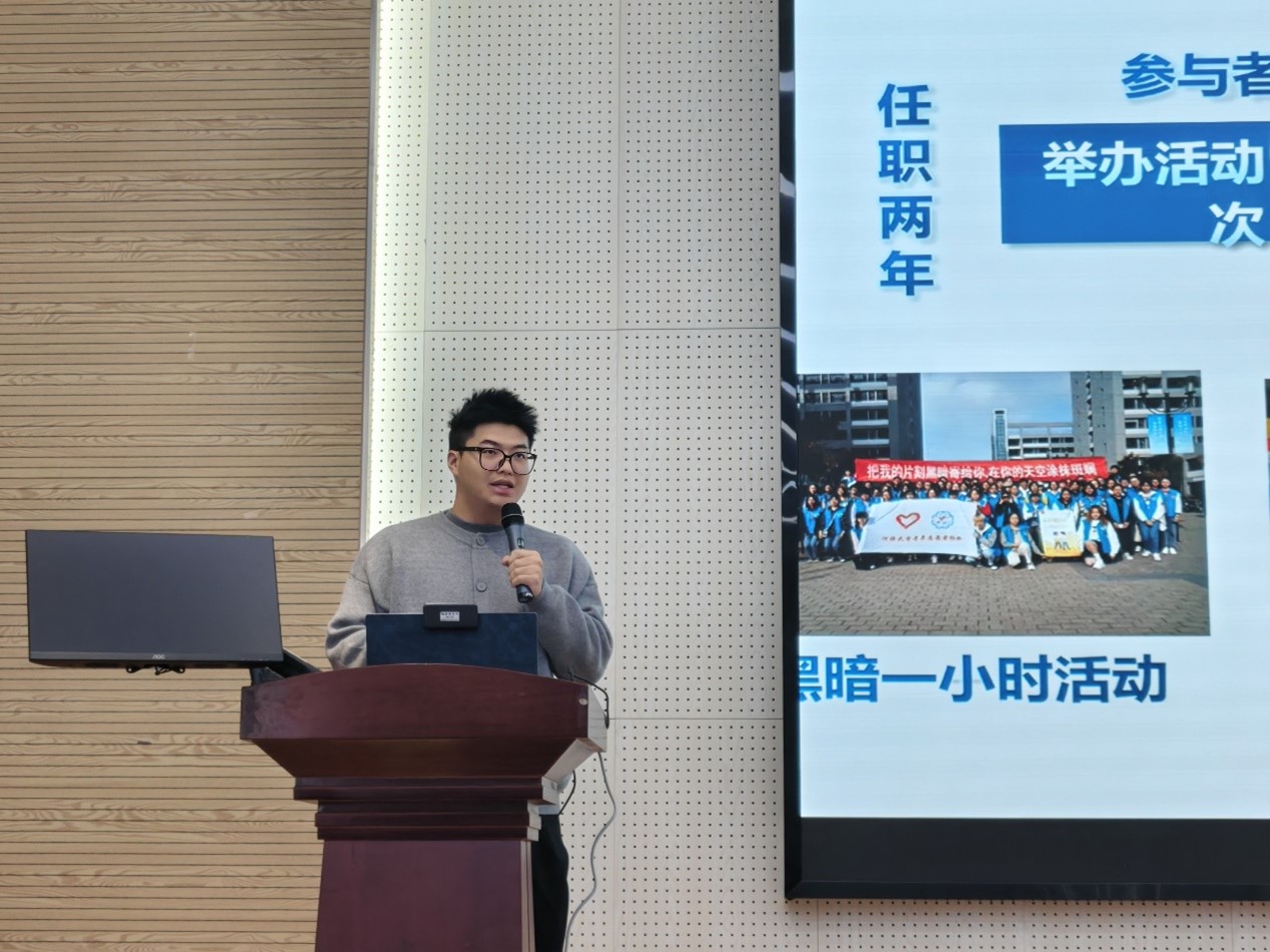 作为河海大学“十佳志愿者”,孙悦洋以“立志达愿微光燃,青春践行温暖传”为主题,分享多维度志愿实践,鼓励新生结合特长践行志愿精神。他任溯源保护母亲河协会社长期间,带队巡河40次、里程超360公里,呼吁新生以“以水为媒”践行公益,在服务他人中找到青春的温度与重量。