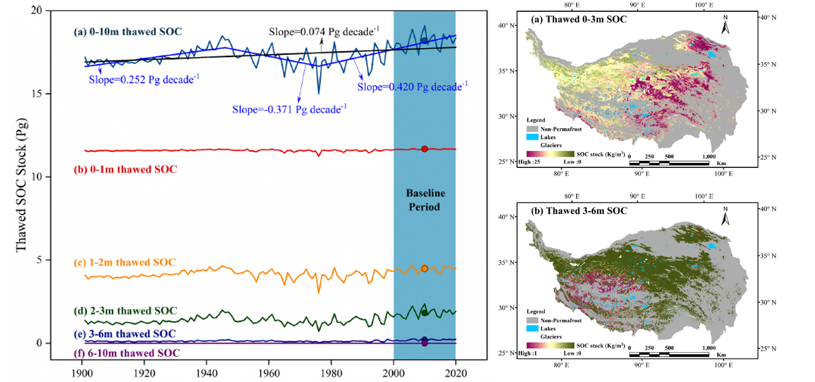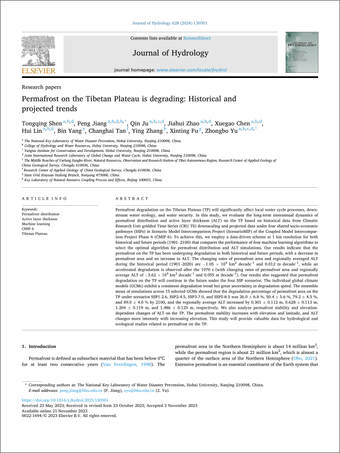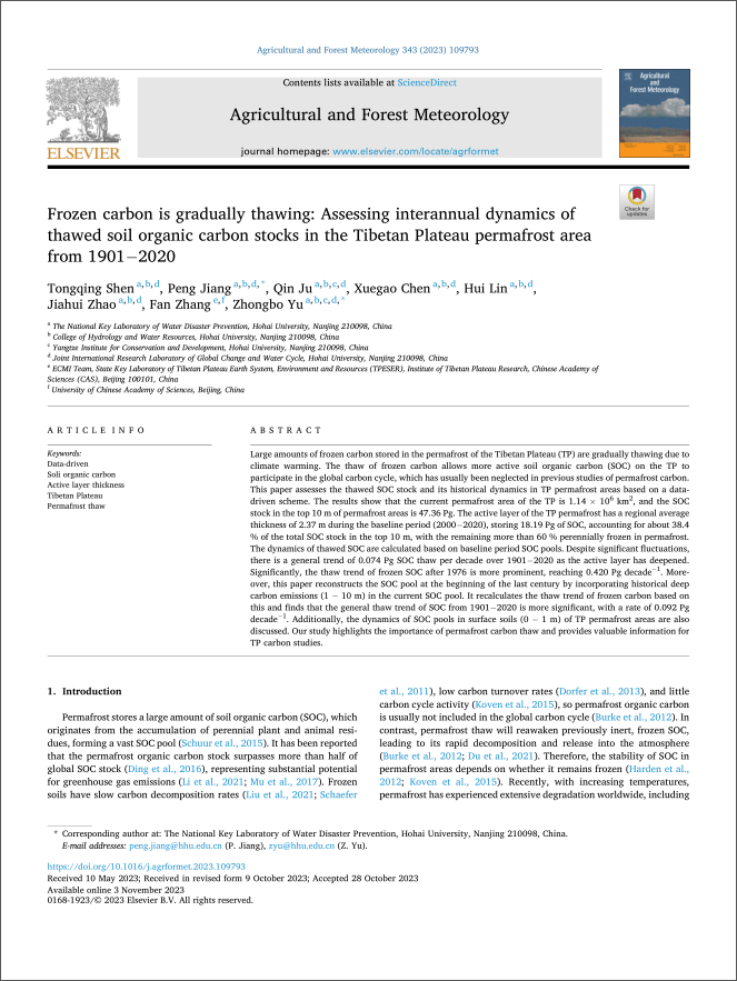 论文基于数据驱动方案,揭示了青藏高原1901−2100期间不同河源区的永久冻土演变规律(图2,图3),构建了长序列高时空分辨率的永久冻土面积、活动层厚度数据集,提高了气候变化影响下冻土要素的模拟精度,同时定量评估了青藏高原永久冻土区解冻的有机碳储量并分析了历史动态(图4),为青藏高原永久冻土区气候变化下的生态水文响应评价提供科学依据。论文链接:Shen, T., Jiang, P., Ju, Q., Chen, X., Lin, H., Zhao, J., Zhang, F., Yu, Z., 2023. Frozen carbon is gradually thawing: Assessing interannual dynamics of thawed soil organic carbon stocks in the Tibetan Plateau permafrost area from 1901−2020. Agricultural and Forest Meteorology 343, 109793. https://doi.org/10.1016/j.agrformet.2023.109793Shen, T., Jiang, P., Ju, Q., Zhao, J., Chen, X., Lin, H., Yang, B., Tan, C., Zhang, Y., Fu, X., Yu, Z., 2024. Permafrost on the Tibetan Plateau is degrading: Historical and projected trends. Journal of Hydrology 628, 130501. https://doi.org/10.1016/j.jhydrol.2023.130501